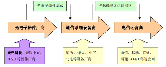 在光纖通信的產業(yè)鏈上,光電子器件生產處于產業(yè)鏈的上游,光電子器件行業(yè)的下游主要是通信系統(tǒng)設備行業(yè),光電子器件產品由通信系統(tǒng)設備廠商系統(tǒng)集成為光傳輸設備,然后再由通信系統(tǒng)設備廠商提供給電信運營商,由電信運營商構建完整的通信網絡后向消費者提供各種電信服務。