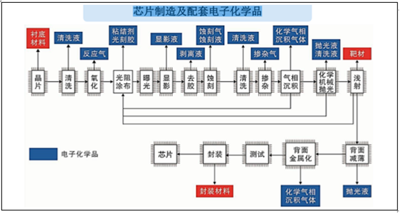 在完整的半導(dǎo)體生產(chǎn)工藝中,電子化學(xué)品使用頻率高且涉及的品種很多,以集 成電路為例,從硅片作為襯底開始,一直到形成芯片,幾乎每步工序都需要電 子化學(xué)品 包括清洗液、反應(yīng)氣、粘結(jié)膠、光刻膠、顯影液、剝離液、蝕刻氣、蝕刻液、 清洗液、摻雜氣、化學(xué)氣相沉積氣體、拋光液清洗液、靶材、拋光液、化學(xué)氣 相沉積氣體、封裝材料等。