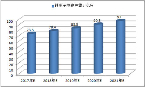 2015年,中國鋰離子電池產(chǎn)量為56.0億只,同比增長3.1%。;2016年1-9月,產(chǎn)量達(dá)到52.4億只,同比增長32.8%。預(yù)計(jì)2017年中國鋰離子電池產(chǎn)量將達(dá)到73.5億只,未來五年(2017-2021)年均復(fù)合增長率約為7.17%,2021年中國鋰離子電池產(chǎn)量將達(dá)到97.0億只。