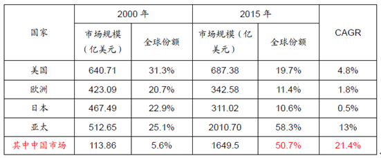 2000年~2015年的16年里,中國(guó)半導(dǎo)體市場(chǎng)增速領(lǐng)跑全球,達(dá)到21.4%,其中全球半導(dǎo)體年均增速是3.6%,美國(guó)將近5%,歐洲和日本都較低,亞太較高13%。就市場(chǎng)份額而言,目前中國(guó)半導(dǎo)體市場(chǎng)份額從5%提升到50%,成為全球的核心市場(chǎng)。