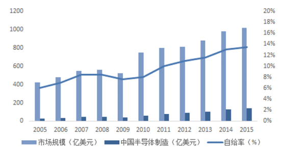 從市場(chǎng)規(guī)模和自制能力的角度來(lái)看,中國(guó)作為全球半導(dǎo)體核心市場(chǎng),對(duì)半導(dǎo)體存在巨大需求,可是根據(jù)ICinsights的數(shù)據(jù),2015年國(guó)內(nèi)的半導(dǎo)體自給率僅為13.5%左右。